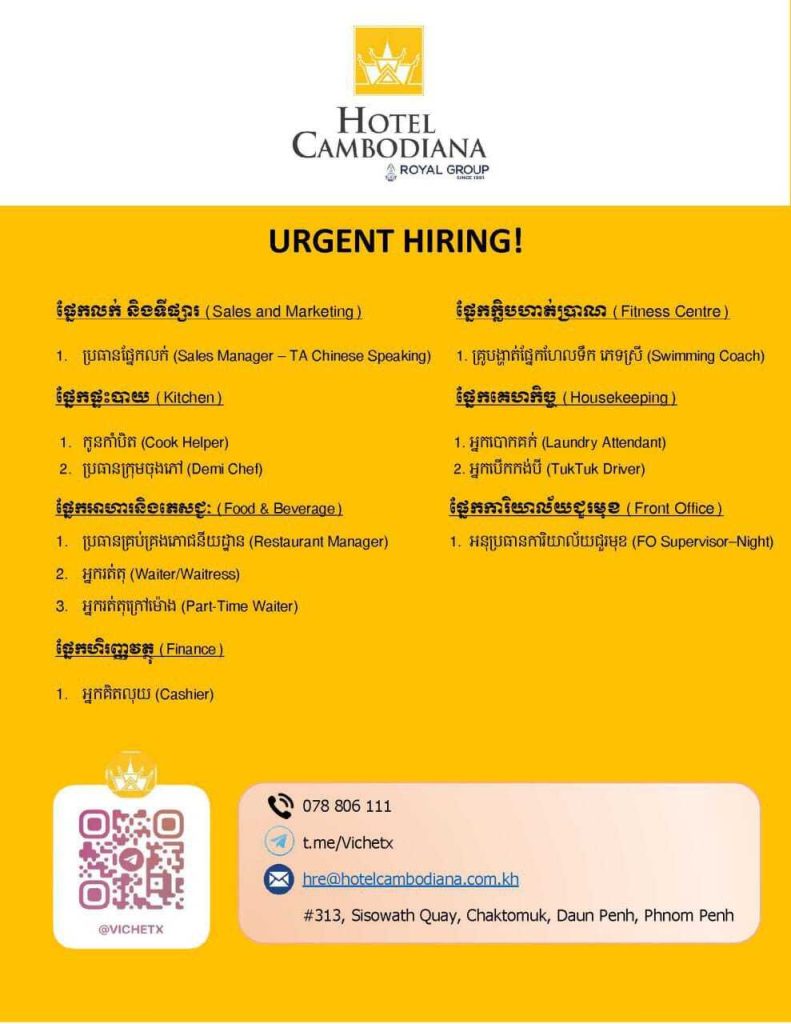 We’re always looking for exceptional people to work with us, please send your CV to hre@hotelcambodiana.com.kh or call us at (+855) 078 806 111